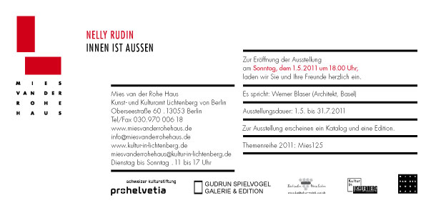 | Aktuelles: Außer Haus AUSSTELLUNG: Nelly Rudin: "Innen ist außen" Mies van der Rohe Haus / Berlin 01.05. - 31.07.2011 Vernissage: Sonntag, 1. Mai 2011, 18:00 Uhr Es spricht: Werner Blaser (Architekt, Basel)