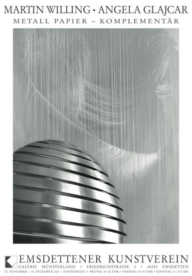 | Aktuelles: Außer Haus AUSSTELLUNG: Martin Willing - Angela Glajcar Metall Papier - Komplementär Emsdtettener Kunstverein Galerie Münsterland Friedrichstr. 3 48282 Emsdetten 20. November - 18. Dezember 2011 Öffnungszeiten: Donnerstag + Freitag 16-20 Uhr, Samstag 15-18 Uhr, Sonntag 11-18 Uhr