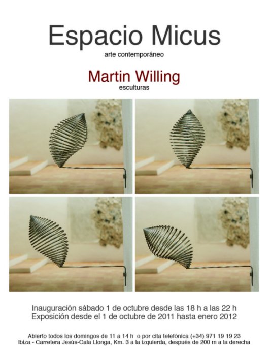 | Aktuelles: Außer Haus AUSSTELLUNG: Martin Willing - esculturas Espacio Micus - arte contemporàneo Carretera Jesus-cala Llonga, Km 3 07849 Santa Eularia Des Riu, Ibiza, Spanien 01. Oktober 2011 - Januar 2012 Vernissage: Samstag, 1. Oktober 2011, 18:00 Uhr Öffnungszeiten: Sonntags 11 -14 Uhr sowie nach telefonischer Vereinbarung